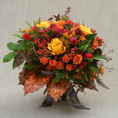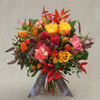 Гвоздика оранжевая - 7 шт; Тюльпан оранжевый - 9 шт; Роза Кения 40 Сонриса - 4 шт; Роза Александра красная - 2 шт; Асклепия - 4 шт; Берцелия - 3 шт; Роза кустовая 50 см оранжевая - 5 шт; Листья магнолия - 0,2 шт; Листья фисташки - 0,2 шт; Листья салал - 0,2 шт; Листья рускус италия (Пучок) - 0,2 шт; Листья эвкалипт с яг/цв/краш - 0,2 шт; Упаковка - 1 шт.