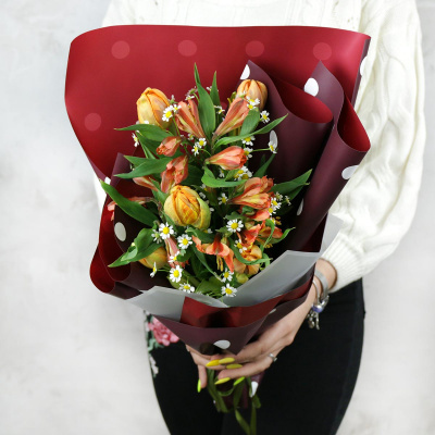 Букет из тюльпанов, альстромерий и ромашки| 3 700 Р | без скидки |