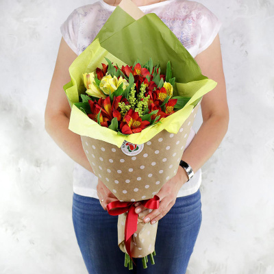 Альстромерия желтая, Альстромерия желтая, Упаковка в ассортименте, Бумага упаковочная Тишью, Лента, Плёнка прозрачная