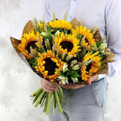 Букет из подсолнухов и альстромерий с листьями фисташки| 5 000 Р | без скидки |