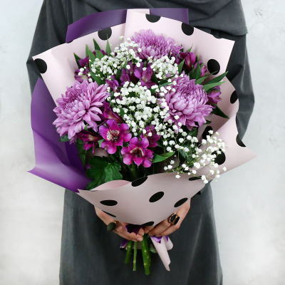 Хризантема одноголовая розовая, Альстромерия желтая, Гипсофила, Упаковка в ассортименте, Лента, Плёнка прозрачная