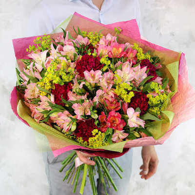 Букет из альстромерий, гвоздик и листьев фисташки| 6 600 Р | без скидки |