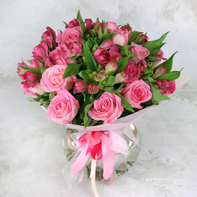 Букет из розовых роз и альстромерий в упаковке| 6 900 Р | без скидки |