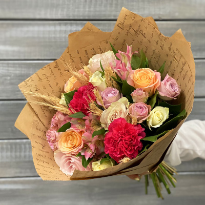 Тритикум пшеница (Сушеный),Гвоздика,Роза РС 50 см,Роза Эквадор 60 см,Альстромерия,Роза 40 см,Листья салал,Роза кустовая 50 см,Бумага упаковочная Крафт,Лента,Плёнка прозрачная