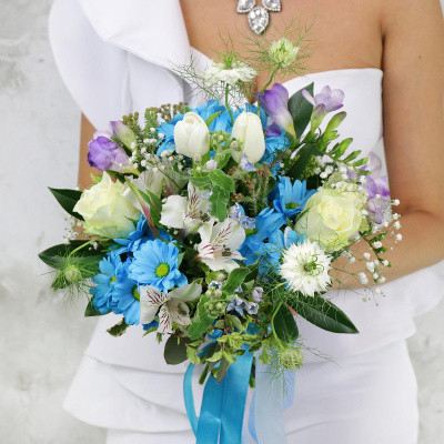 Фрезия белая, Дельфиниум ВС синий, Латирус фиолетовый, Статица, Гипсофила, Гиацинт синий, Листья эвкалипт микс, Лента, Плёнка прозрачная