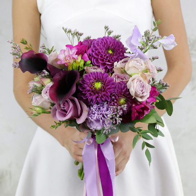 Георгина оранжевая, Латирус фиолетовый, Калла 60 см белая, Фрезия белая, Гвоздика оранжевая, Гвоздика лунная фиолетовая, Роза кустовая Клустер кремовая, Роза Оушен сонг 40 см - 50 см, Лимониум фиолетовый, Листья салал, Листья эвкалипт микс, Лента, Плёнка прозрачная