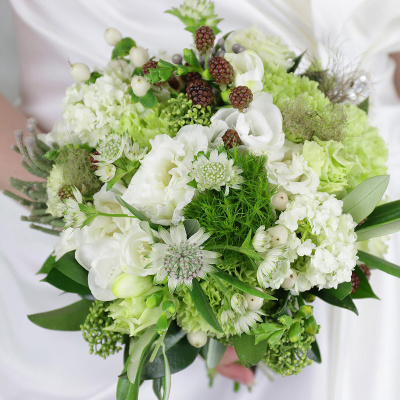 Лизиантус, Фрезия белая, Вибурнум розеум, Гвоздика оранжевая, Гвоздика барбарелла грин трик, Ежевика (Рубус), Гиперикум красный, Астрантия, Листья рускус, Листья олива, Котинус (пучок), Скимия кью грин, Капс Бруниа, Латирус фиолетовый, Шнур декоративный, Лента, Плёнка прозрачная