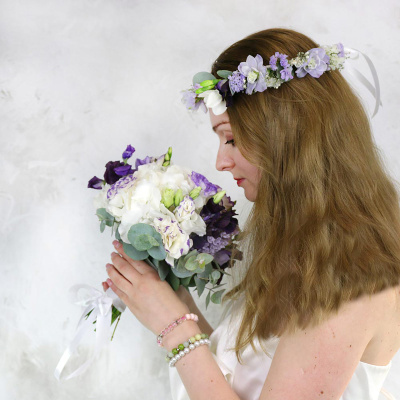Свадебный венок из фрезий, гипсофил и дельфиниумов| 4 000 Р | без скидки |