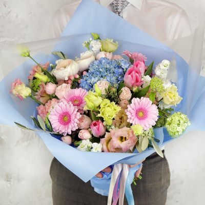 Гортензия,Гербера Акция,Роза кустовая 40 см розовая,Листья питтоспорума микс,Упаковка в ассортименте,Лента,Плёнка прозрачная