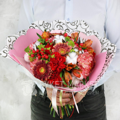 Букет из гвоздик и гербер с хлопком| 4 990 Р | без скидки |