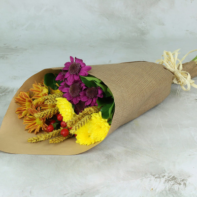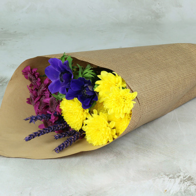 Анемон синий, Хризантема кустовая желтая, Хризантема кустовая желтая, Тритикум (Пшеница) краш, Бумага упаковочная Крафт, Лента, Плёнка прозрачная