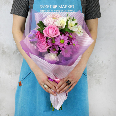 Хризантема одноголовая розовая, Альстромерия желтая, Гипсофила, Упаковка в ассортименте, Лента, Плёнка прозрачная