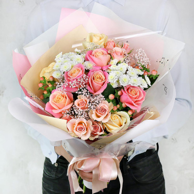 Роза РС 60 см Аваланж пич - 3 шт; Роза РС 60 см Мисс пигги - 5 шт; Роза кустовая 60 см розовая - 2 шт; Хризантема кустовая белая ромашка - 2 шт; Гипсофила - 2 шт; Гиперикум розовый - 3 шт; Упаковка в ассортименте - 3 шт; Лента - 2 шт; Плёнка прозрачная - 1 шт.