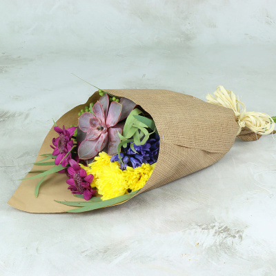Эхеверия Минима (D9), Хризантема кустовая желтая, Хризантема кустовая желтая, Капс, Гиацинт синий, Листья эвкалипт микс, Бумага упаковочная Крафт, Лента, Плёнка прозрачная