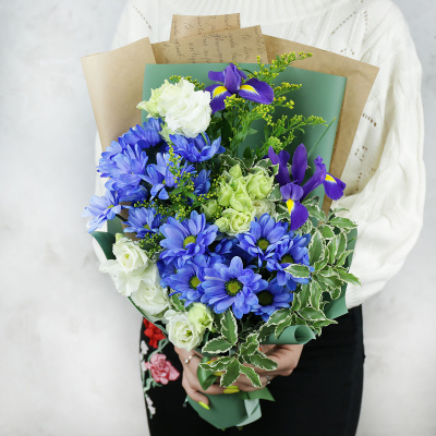 Хризантема куст. ВС синяя,Лизиантус белый,Солидаго микс,Ирис,Листья питтоспорума микс,Упаковка в ассортименте,Лента,Плёнка прозрачная