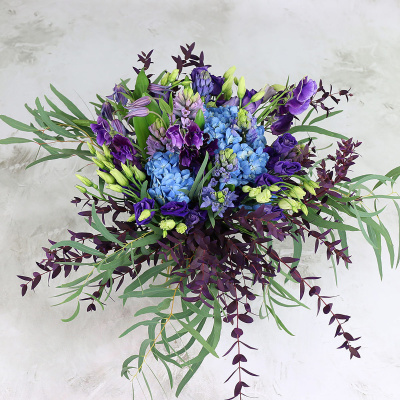 Гортензия белая, Гиацинт синий, Клематис фиолетовый, Латирус фиолетовый, Лизиантус, Листья эвкалипт микс, Листья эвкалипт с яг/цв/краш, Плёнка прозрачная
