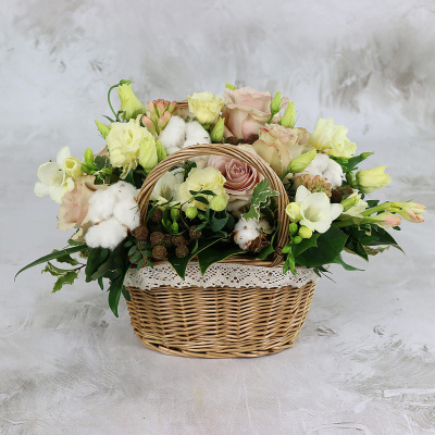 Корзина плетеная стандарт сред, Оазис кирпич, Лизиантус, Роза Эквадор 60 см розовая, Фрезия белая, Доп. услуги флориста, Хлопок, Плёнка прозрачная, Капс, Скимия кью грин, Листья хедера (пучок), Листья магнолия, Листья питтоспорума микс, Листья фисташки