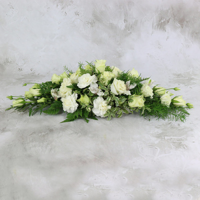 Гортензия белая, Листья салал, Пион коралловый, Листья дуба (пучок), Хризантема сантини зеленая, Листья хоста, Лизиантус, Гвоздика лунная фиолетовая, Эрика, Садовый микс (павл), Комплект аквабокс, Листья питтоспорума микс, Коробка шляпная малая, Бумага упаковочная Крафт, Лента, Плёнка прозрачная