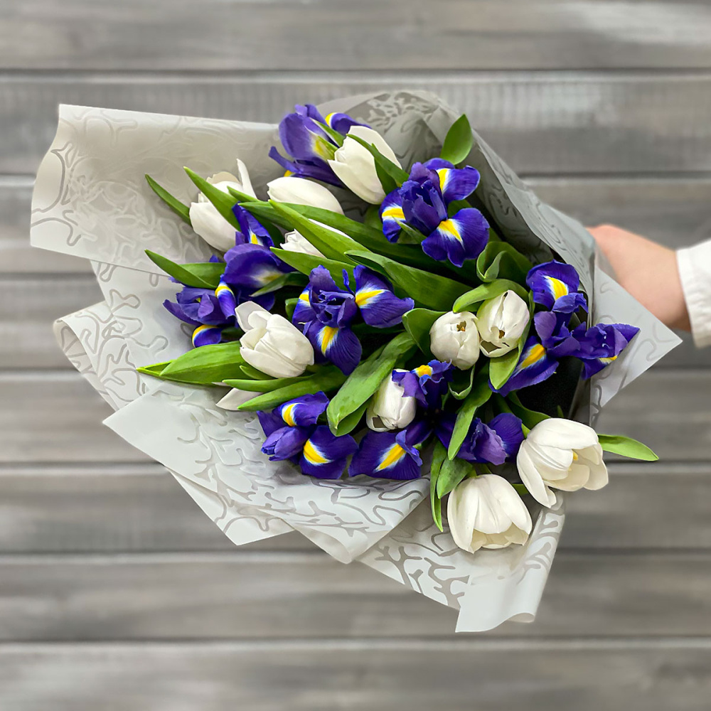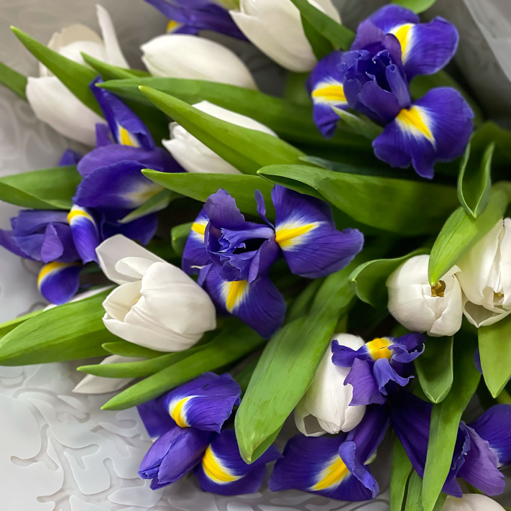 Тюльпан,Ирис,Листья фисташки,Упаковка в ассортименте,Бумага упаковочная Тишью,Лента,Плёнка прозрачная