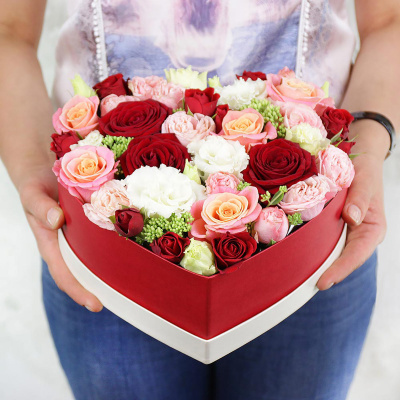 Коробка Сердце (25х23х10см), Оазис кирпич, Роза РС 60 см коралловая, Роза РС 40 см кремовая, Роза кустовая 40 см розовая, Роза кустовая 60 см кремовая, Лизиантус, Седум, Лента, Плёнка прозрачная
