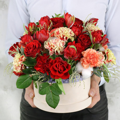 Композиция из роз, гвоздик и гиперикума в шляпной коробке| 5 300 Р | без скидки |