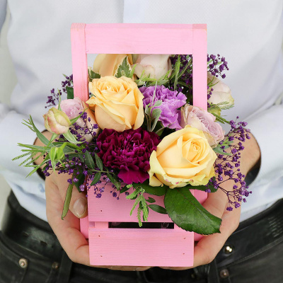 Композиция из гвоздик, роз и гипсофил в декоративном ящике| 4 000 Р | без скидки |