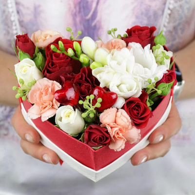 Композиция из роз, фрезий и гвоздик в сердце| 4 600 Р | без скидки |