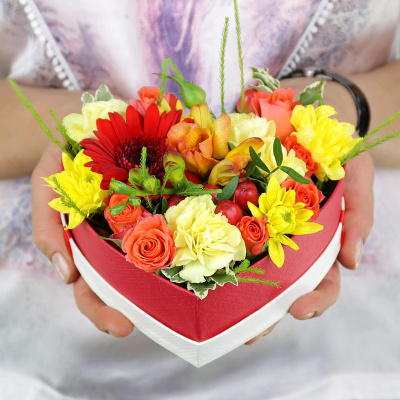 Коробка подарочная Сердце, 0228-7PK_1, Оазис кирпич, Роза РС 40 см кремовая, Роза РС 60 см коралловая, Роза кустовая 50 см РС белая, Хризантема кустовая желтая, Астра, Листья эвкалипт микс, Лента, Плёнка прозрачная