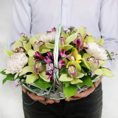Композиция из орхидей, хризантем и альстромерий в плетеной корзине| 10 200 Р | без скидки |
