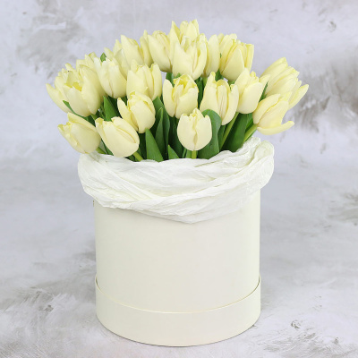 25 белых тюльпанов в белой шляпной коробке| 8 700 Р | без скидки |