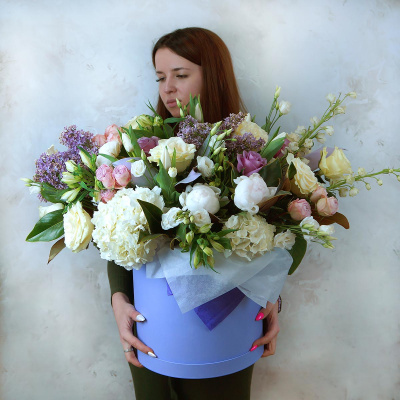 Пион высший сорт,Роза Мондиаль 60 см,Сирень,Лизиантус,Гортензия,Листья магнолия,Коробка шляпная большая,Оазис кирпич,Роза кустовая 50 см,Альстромерия,Листья салал,Дельфиниум,Тюльпан,Бумага упаковочная Тишью,Плёнка прозрачная