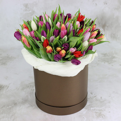 101 разноцветный тюльпан в шляпной коробке| 24 700 Р | без скидки |