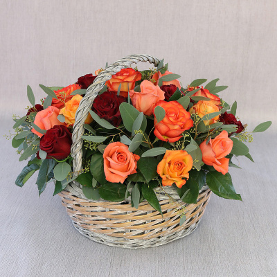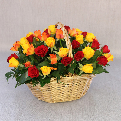51 красная, желтая и оранжевая роза в корзине, Кения| 7 200 Р | без скидки |