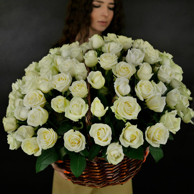 Букет из 101 белой розы в плетеной корзине, Россия| 21 300 Р | без скидки |