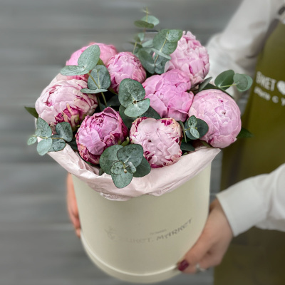 Композиция в шляпной коробке из пионов и листьев эвкалипта| 11 100 Р | без скидки |