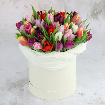 51 разноцветный тюльпан в шляпной коробке| 12 700 Р | без скидки |