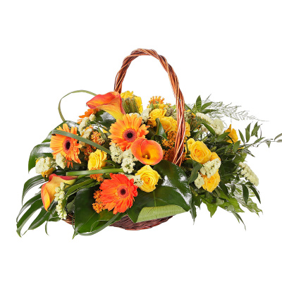 Корзина с оранжевыми герберами и каллами| 15 400 Р | без скидки |