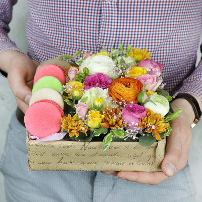 Коробка с макарунами. ранункулюсы, розы и хризантема8 380 Р
