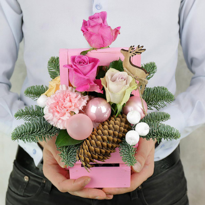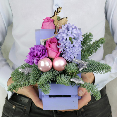 Новогодняя композиция из ёлки, гиацинтов, роз и гвоздик в ящике| 3 700 Р | без скидки |