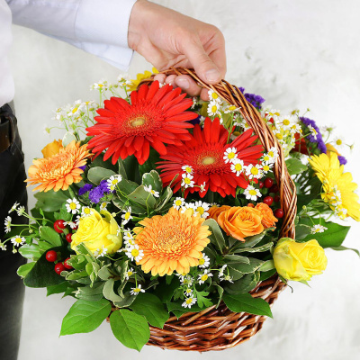 Композиция из гербер, роз и ромашек в плетеной корзине| 10 200 Р | без скидки |