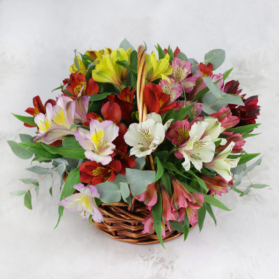 Композиция из разноцветных альстромерий и эвкалипта в корзине| 6 300 Р | без скидки |