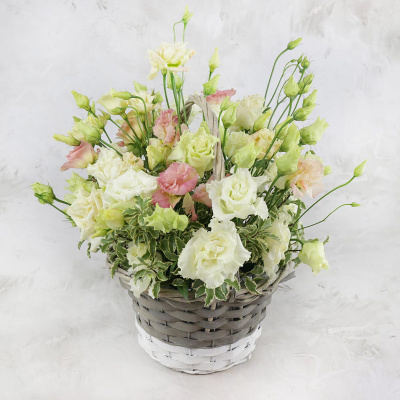 Композиция из 15 лизиантусов с листьями питтоспорума в корзинке| 6 800 Р | без скидки |