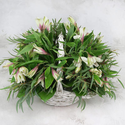 Композиция из белых альстромерий с эвкалиптом в корзине| 9 200 Р | без скидки |