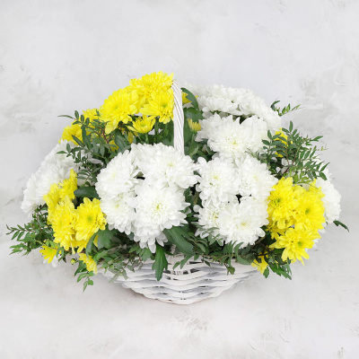Хризантема кустовая желтая, Хризантема кустовая желтая, Листья фисташки, Корзина плетеная стандарт сред, Оазис кирпич, Лента, Плёнка прозрачная