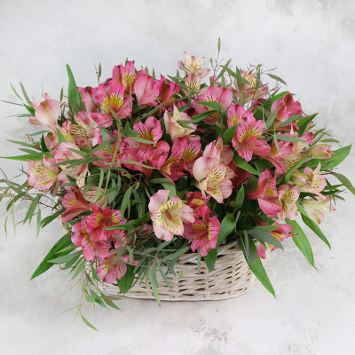 Композиция из розовых альстромерий и эвкалипта в корзине| 9 800 Р | без скидки |