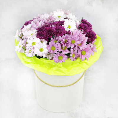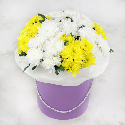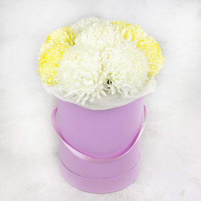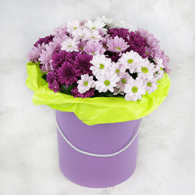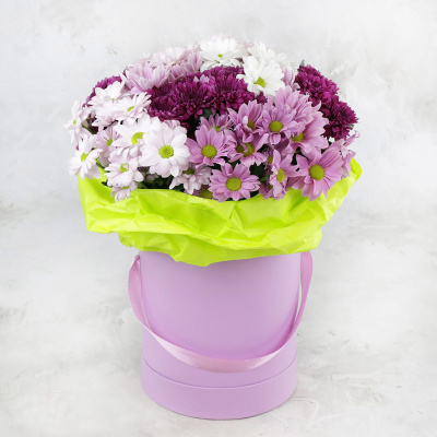 Композиция из разноцветных кустовых хризантем в шляпной коробке| 9 200 Р | без скидки |
