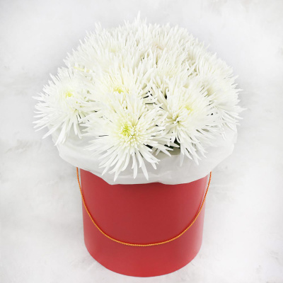 15 белых кустовых хризантем в красной шляпной коробке| 9 400 Р | без скидки |