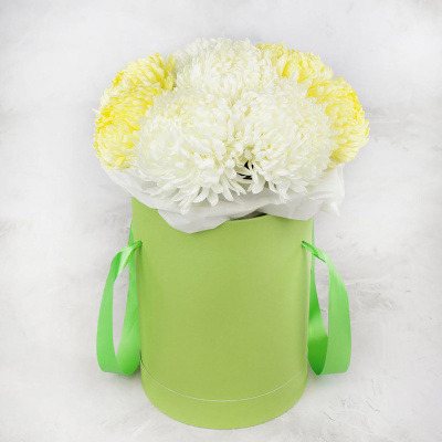 Хризантема кустовая желтая, Коробка шляпная большая, Комплект аквабокс, Бумага упаковочная Тишью, Лента, Плёнка прозрачная