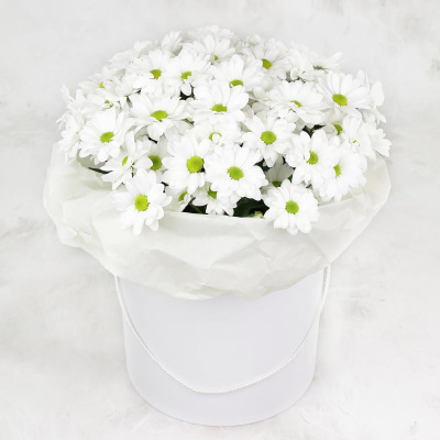 Хризантема одноголовая белая, Коробка шляпная большая, Комплект аквабокс, Бумага упаковочная Тишью, Лента, Плёнка прозрачная