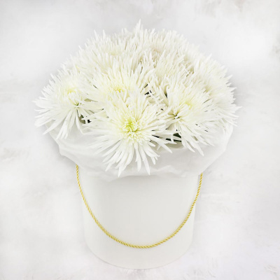 15 белых кустовых хризантем в шляпной коробке| 9 300 Р | без скидки |